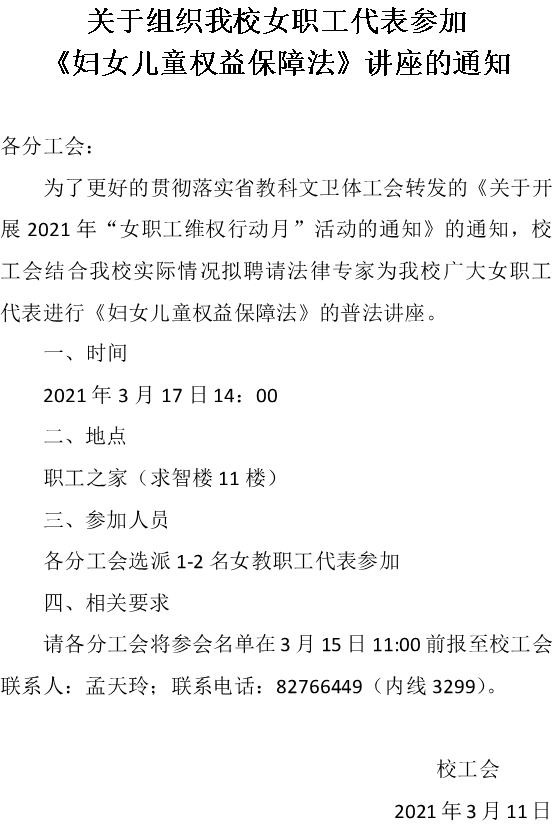 关于组织我校女职工代表参加《中华人民共和国妇女权益保障法》讲座的通知